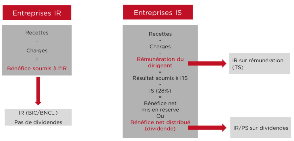 Les exploitants individuels ne peuvent pas recevoir de dividendes puisqu’il n’existe pas de société (confusion des patrimoines privés et professionnel). Ils sont également taxés à l’IR sur l’ensemble des résultats dégagés chaque année.